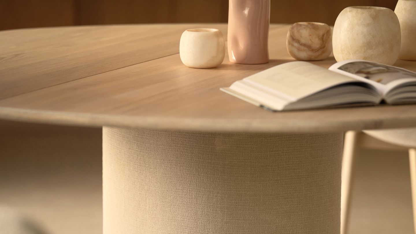 Der Holzsockel kann optional gepolstert werden, was dem Tisch Wärme, Haptik und eine weichere Optik verleiht.