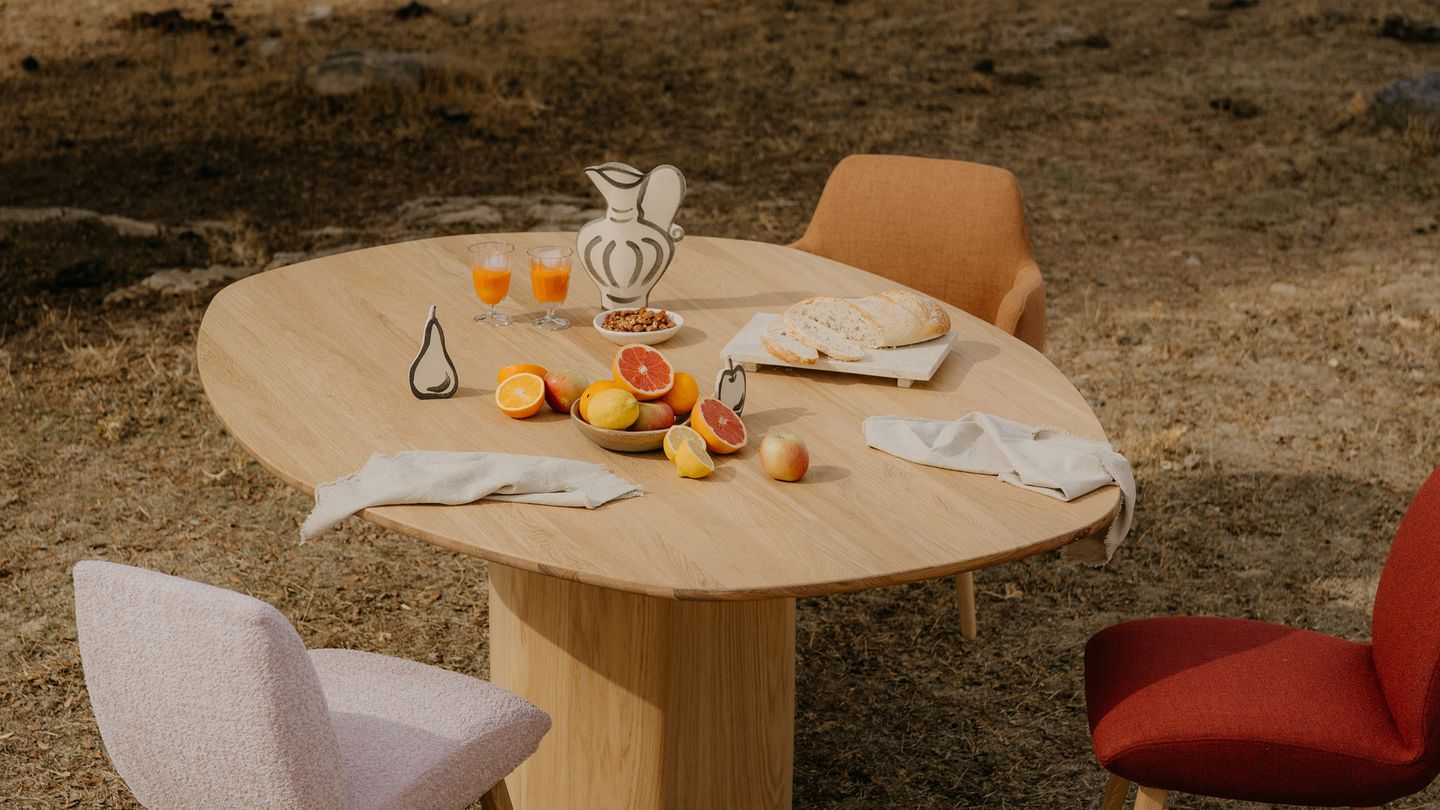Sein skulpturaler Sockel – je nach Tischgröße als zentraler Sockel oder als Doppel-Sockel-Konfiguration erhältlich – trägt eine unregelmäßig geformte Tischplatte aus Holz und schafft so eine organische und bewusst unkonventionelle Silhouette.