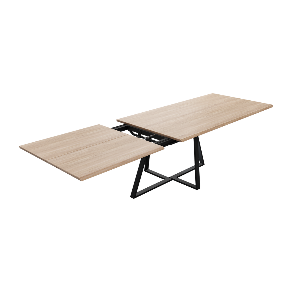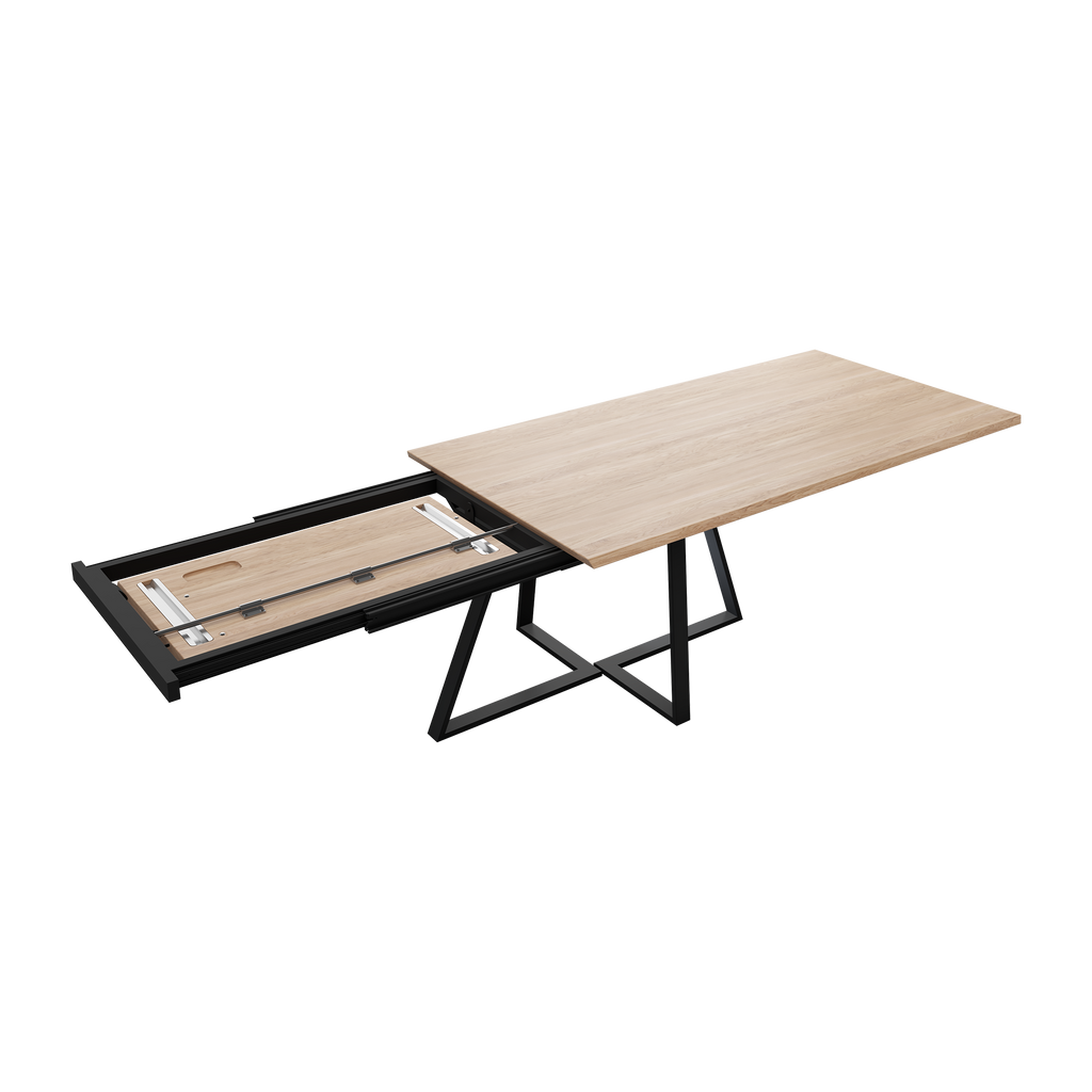 Transitioning from a family or professional meeting in a snap? It’s possible with the Japura table and its 1-meter extension. This table extends easily thanks to its classic unfolding system. Its extra touch? The extension is height adjustable for a seamless and harmonious connection to the top. The top, made of rustic oak (with open or closed knots) or classic oak, reveals an authentic and modern aesthetic. Its central leg, ensuring stability, along with its metal frame, accentuates its contemporary side.
