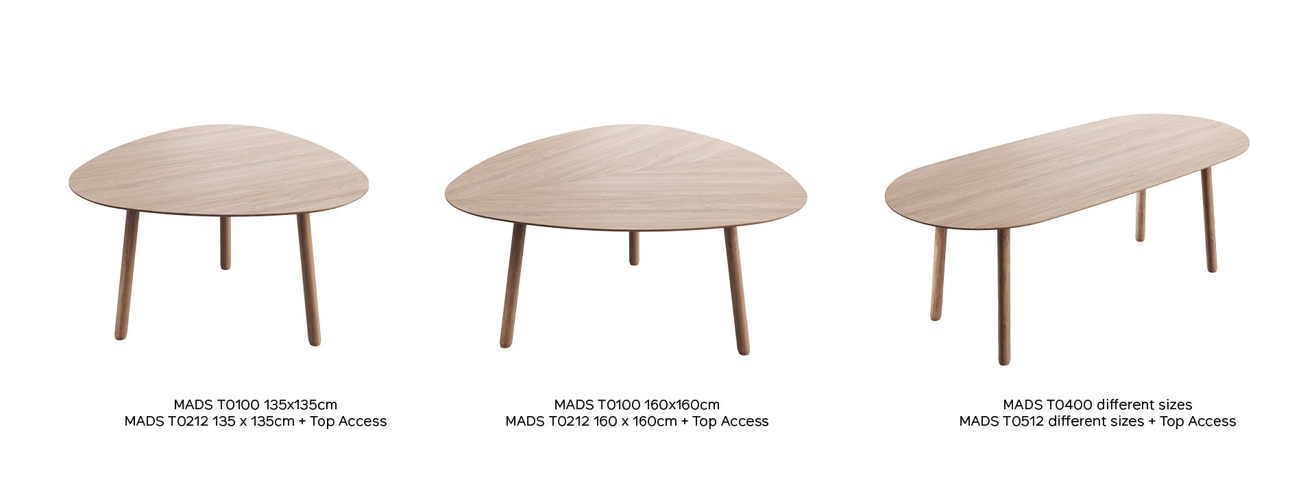 Mads est disponible en forme ovale ou soft triangle. Pour les projets de bureau, les trois versions peuvent être équipées d’un top access en option.